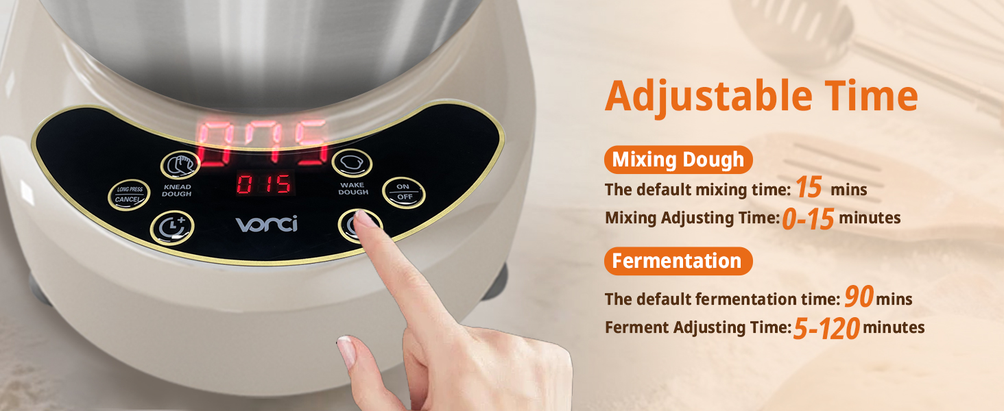 The electric dough mixer is precisely controlled by a microcomputer to knead and proof dough, allowing you to preset the desired kneading and proofing times. The default mixing time is 15 minutes, and the default proofing time is 90 minutes.