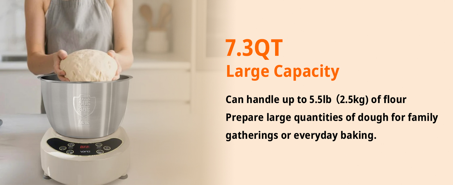 The kitchen dough mixer is equipped with a 7.3qt (7L) stainless steel mixing bowl that can handle up to 2000g of flour—suitable for making large amounts of dough for family gatherings or everyday baking.Ideal for bread, pizza, pasta, sourdough, scones, dumplings, and steamed buns.
