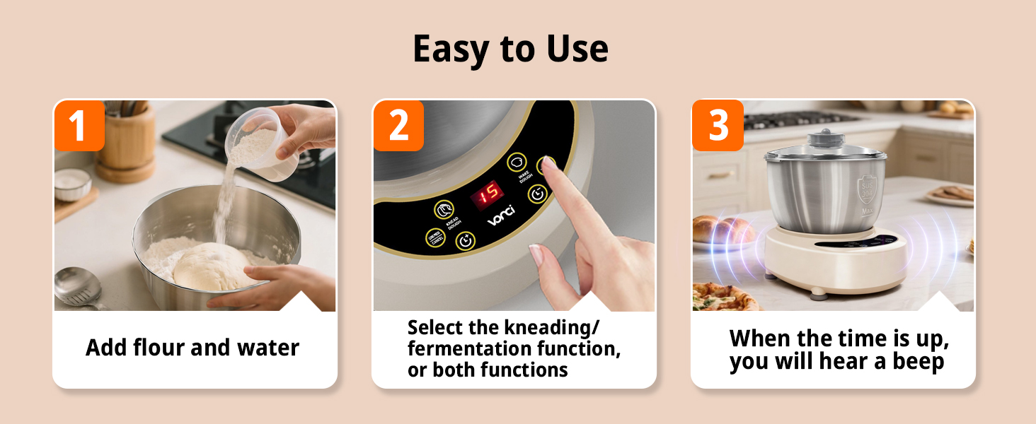 The electric dough mixer is precisely controlled by a microcomputer to knead and proof dough, allowing you to preset the desired kneading and proofing times. The default mixing time is 15 minutes, and the default proofing time is 90 minutes.